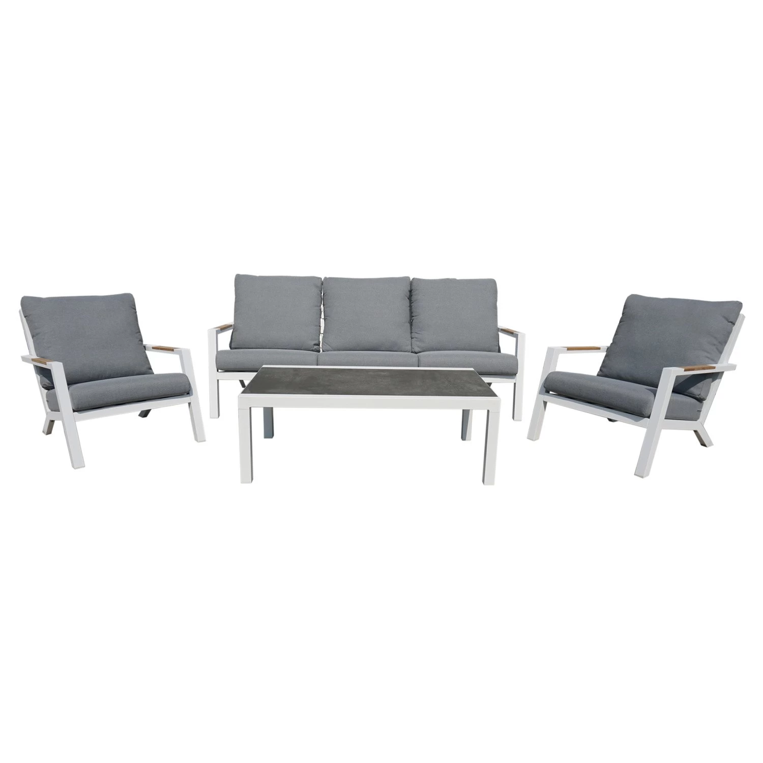 Met de tuinmeubelen uit de RIO serie van Royal Seasons kies je absoluut voor zeer goede kwaliteit. De serie is in het wit uitgebracht en het oogt bijna als een verlengde van je woonkamer! De houten accenten zijn gemaakt van teak hardhout. Verder is deze tuinset gemaakt van aluminium. Aluminium is licht in gewicht en bovendien erg sterk. Daarom wordt aluminium veel gebruikt in de productie van tuinmeubelen. De BLANCO tafel is voorzien van een keramisch tafelblad.